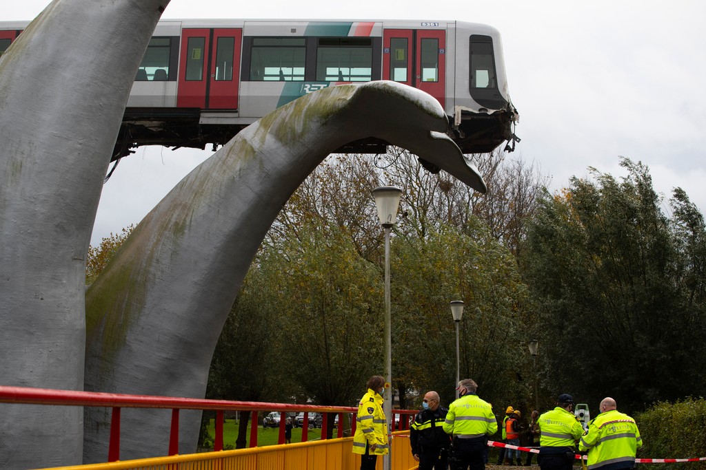 „Metro sa vykoľajilo a zachytilo na soche, ktorá nesie názov 'Zachránený vďaka veľrybiemu chvostu'. A to sa naozaj aj stalo," uviedla Carly Gorterová z regionálneho bezpečnostného úradu.