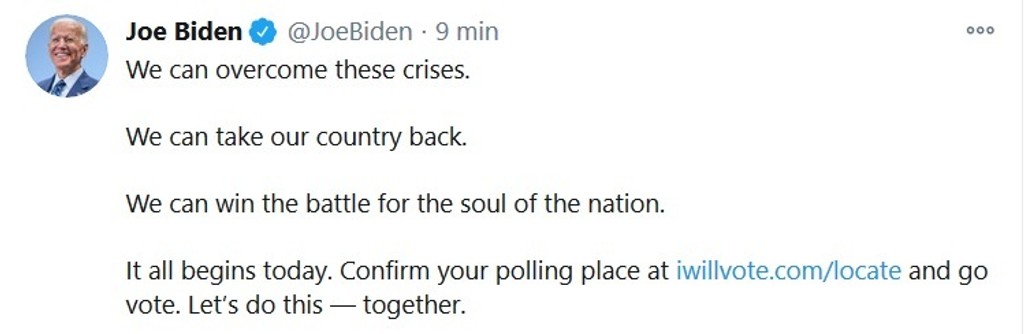 15.05 - Demokratický kandidát Biden sa opäť "prihovoril" svojim priaznivcom na Twitteri. "Môžeme prekonať túto krízu. Môžeme si vziať späť našu krajinu. Môžeme vyhrať bitku o dušu národa," napísal.