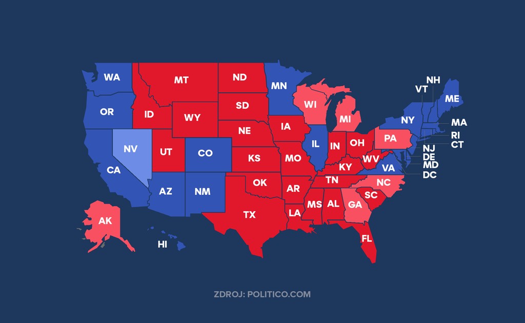 (Tmavou farbou sú označené štáty, kde je už jasný víťaz volieb. Bledou farbou sú označené štáty, kde sú výsledky priebežné)