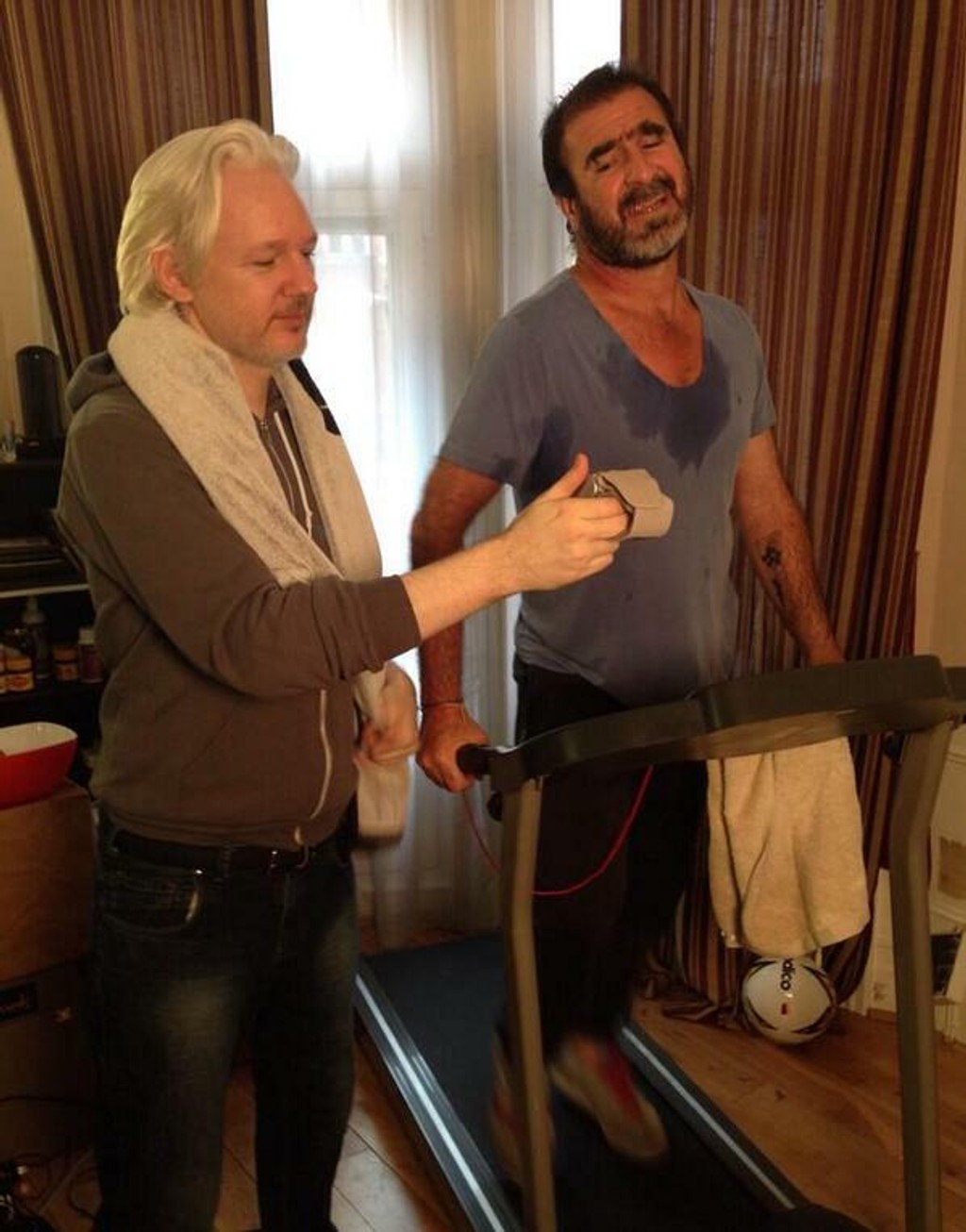 Svetlo sveta uzrelo veľmi zvláštne video ešte zvláštnejšej dvojice. Bývalá futbalová hviezda Manchestru United Eric Cantona navštívil zakladateľa WikiLeaks Juliana Assanga v jeho úkryte na ekvádorskej ambasáde. Video zachytáva Erica Cantonu, ako sa trápi a potí na bežiacom páse, zatiaľ čo Assange mu prísnym trénerským pohľadom meria čas.