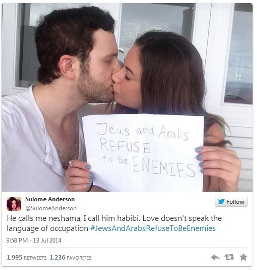 "Môj priateľ vyrastal v ortodoxnej židovskej rodine, moji predkovia pochádzajú z Libanonu," hovorí Sulome Anderson. Internetom začali časom kolovať aj ďalšie fotografie podobných párov, táto je však prvá svojho druhu.
