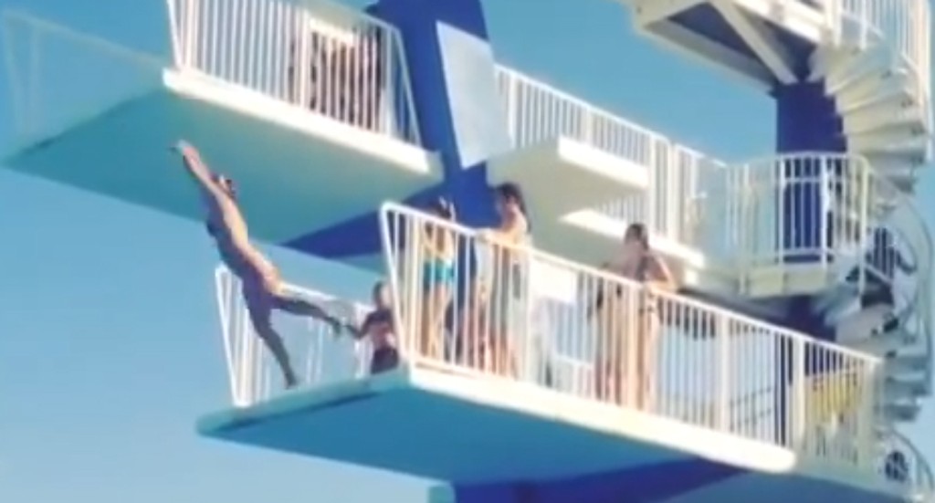 Tak tento skok vôbec nemusel skončiť dobre. Žena v akvaparku Lava Hot Springs v Idahu sa rozhodla skákať z viac ako šesť metrov vysokého mostíka. Vyzerá to však tak, že si to v poslednej chvíli rozmyslela. Alebo sa len pošmykla. Prítomní ľudia sa tak dívali na smrteľne nebezpečný pád.