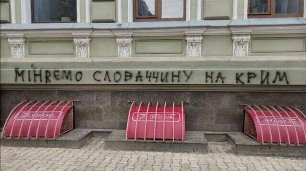Na budove sa objavil nápis „Vymeníme Slovensko za Krym", odkazujúci na výrok slovenského premiéra Igora Matoviča o výmene Zakarpatskej Ukrajiny za ruskú vakcínu Sputnik V, ktorý na Ukrajine vyvolal pobúrenie. Záber zachytávajúci grafity bol zverejnený na sociálnej sieti Telegram.