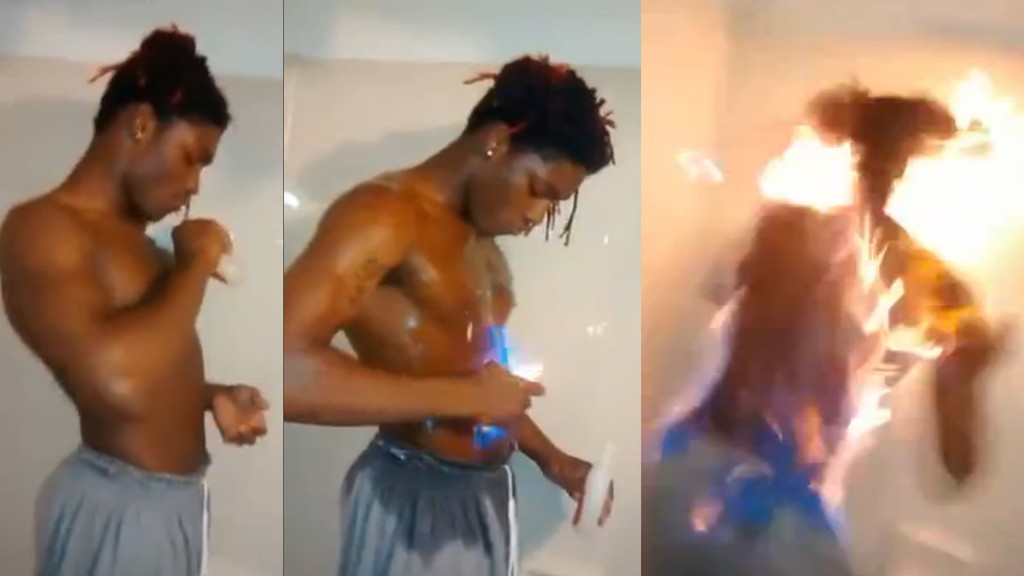 Vo videu je vidieť, ako sa od pol pása hore nahý mladý muž oblieva niečím horľavým a následne si pýta zapaľovač. Čo nasledovalo, si pozrite sami. Muž zbĺkol ako vatra a začal behať a kričať. Kumpánom sa napokon podarilo uhasiť ho. Čo tým chcel dokázať vie zrejme iba on a jeho partia.