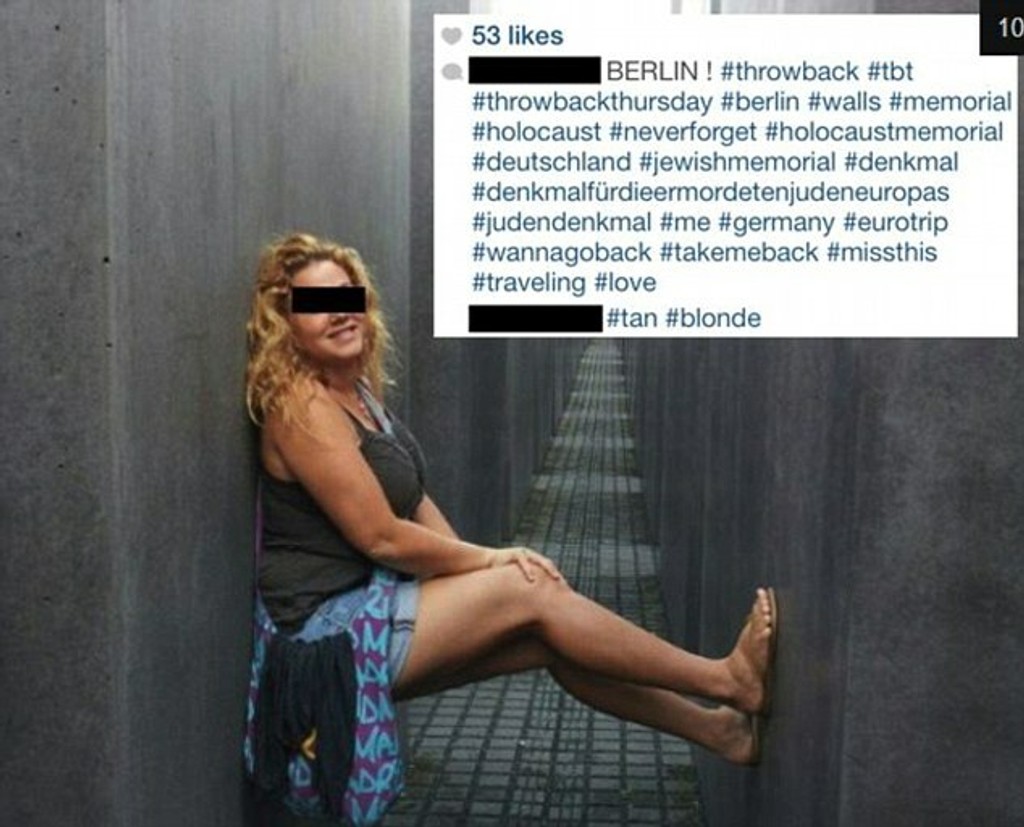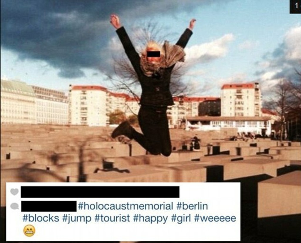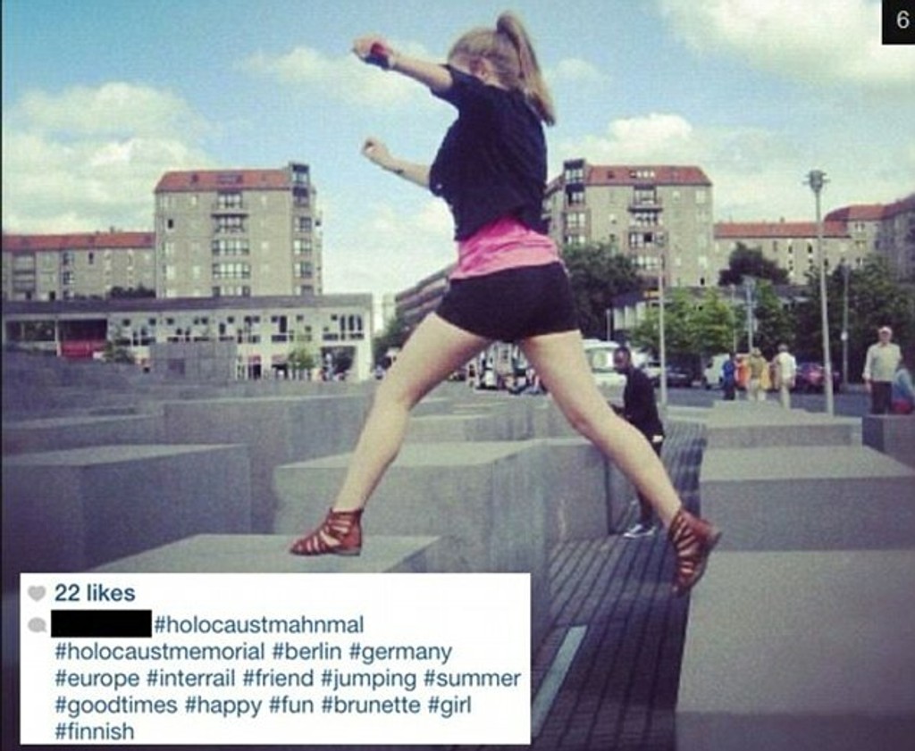 Na snímkach napríklad šantia na berlínskom pamätníku pre šesť miliónov zavraždených európskych Židov, ktorí sú obeťami nacistického vyhladzovacieho programu počas druhej svetovej vojny. Turisti poskakujú po obrovských kameňoch, pózujú so vztýčenými palcami. Jedna turistika ázijského pôvodu dokonca pózuje s vztýčenými prostredníkom.