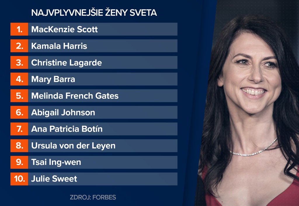 Rebríček najvplyvnejších žien sveta za rok 2021 zverejnil Forbes na svojej webstránke v utorok. Ku každej z vybraných žien, medzi ktorými je 40 topmanažérok, 19 svetových političiek a jedna expertka na imunológiu, autori pripojili fotografiu a krátky profil.