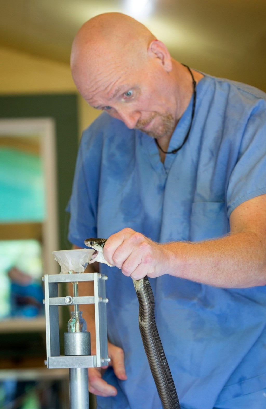 Dojenie je totiž v tomto prípade len slangový výraz pre extrahovanie jedu. Jim každý deň chytá najnebezpečnejšie hady a holými rukami im prikladá hlavy k nádobám, do ktorých púšťajú jed.