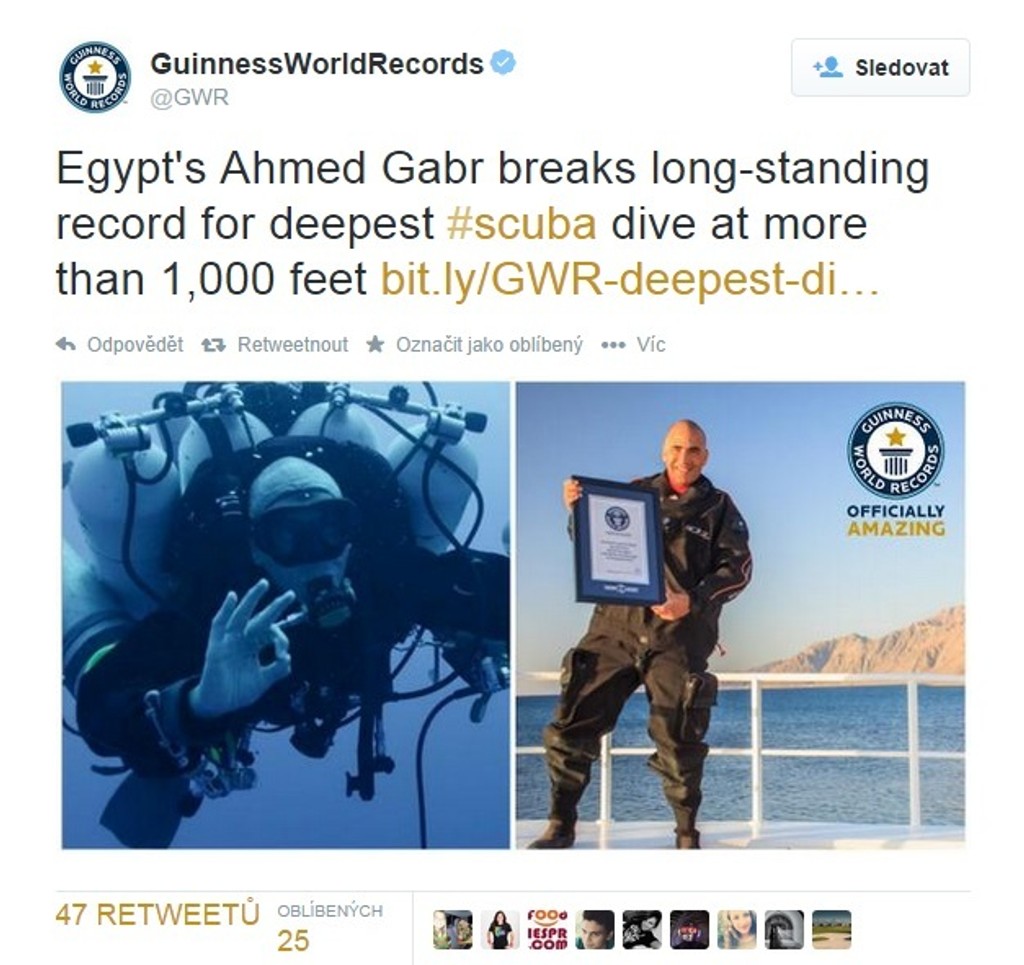 Ahmed Gabr sa ponoril do Červeného mora len minulý týždeň. Hĺbka bola približne rovnaká ako výška známeho mrakodrapu v New York City (Chrysler Building), uvádza portál HuffingtonPost.com. Cesta ku dnu mu trvala dvanásť minút. Pod vodou sa zdržal niekoľko hodín.