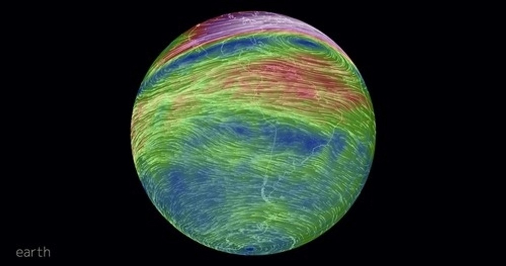 Vetry znázorňujú viacfarebné čiary nad oceánmi a kontinentmi. Pre