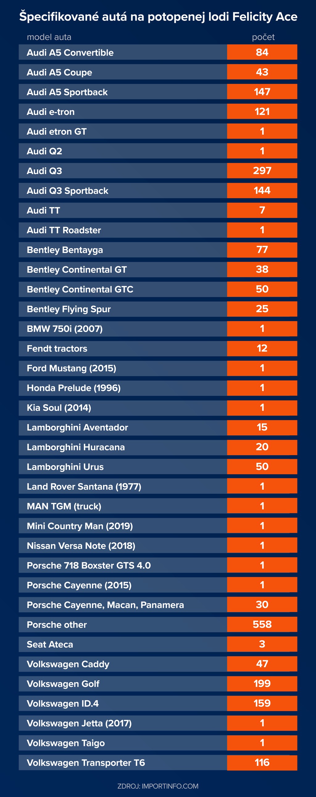 Na verejnosť sa teraz dostal kompletný zoznam áut, ktoré sú nenávratne preč. Ide konkrétne o 1117 vozidiel značky Porsche, 1944 áut Audi, 85 športiakov Lamborghini a 189 automobilov Bentley. Volkswagen prišiel o 561 vozidiel. Medzi zhorenými a utopenými autami boli tiež drahé supersporty či luxusné modely. Na palube boli aj autá určené pre súkromných príjemcov ako napríklad Honda Prelude SiR z roku 1996, Land Rover Santana z roku 1977, BMW 750i z roku 2007 nebo Ford Mustang z roku 2015.