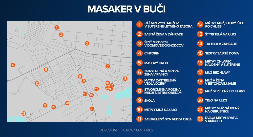 Po tom, ako sa ruská armáda stiahla z ukrajinského mesta Buča severovýchodne od Kyjeva, sa našlo v meste vyše 360 tiel zabitých civilistov, pričom niektoré boli spálené alebo pochované v masových hroboch. Ukrajina zo zabíjania civilistov v Buči vinní Rusko, ktoré však tieto obvinenia popiera.