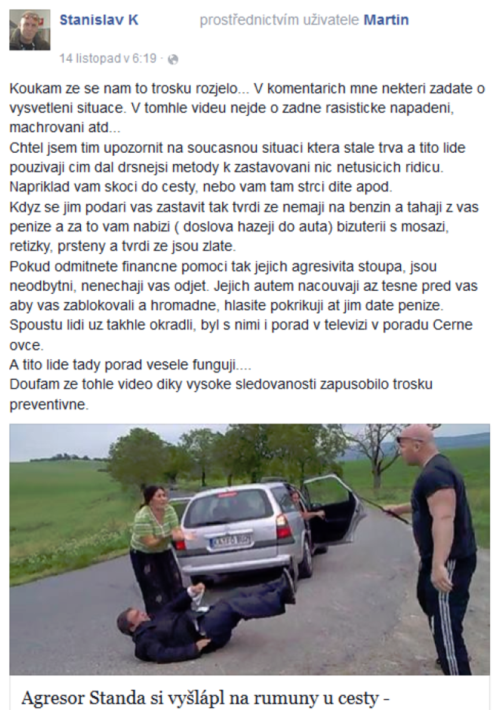 Na videu je vidieť, ako Standa vytiahne teleskopický obušok a zaútočí na muža, ktorý údajne pochádza z Rumunska. Standu vypátrala redakcia na Facebooku. Toto je jeho stanovisko.