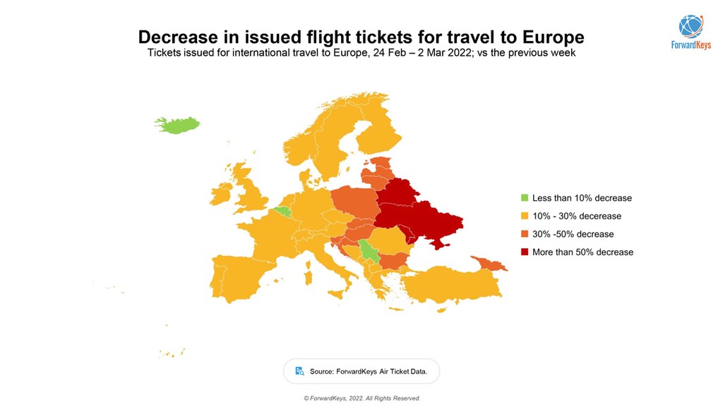 Všetky ostatné európske krajiny okrem Belgicka, Islandu a Srbska (ktoré zaznamenali iba jednociferný pokles) mali menej rezervácií o 10 až 30 percent. Vnútroštátne rezervácie letov v Rusku klesli o takmer 50 percent, uviedol ForwardKeys.