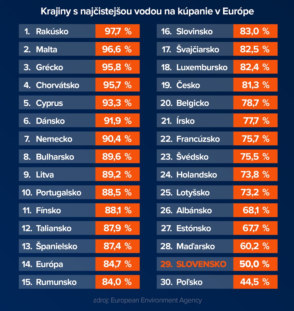 Správa, ktorá pre Slovensko nie je pozitívna. Európska agentúra pre životné prostredie (EEA) zverejnila rebríček krajín v Európe, ktoré sa môžu pýšiť kvalitnou vodou na kúpanie. To sa nedá povedať o našej krajine. Slovensko totálne prepadlo, ocitli sme sa na chvoste. Horšiu známku dostala už iba jedna susedná krajina.