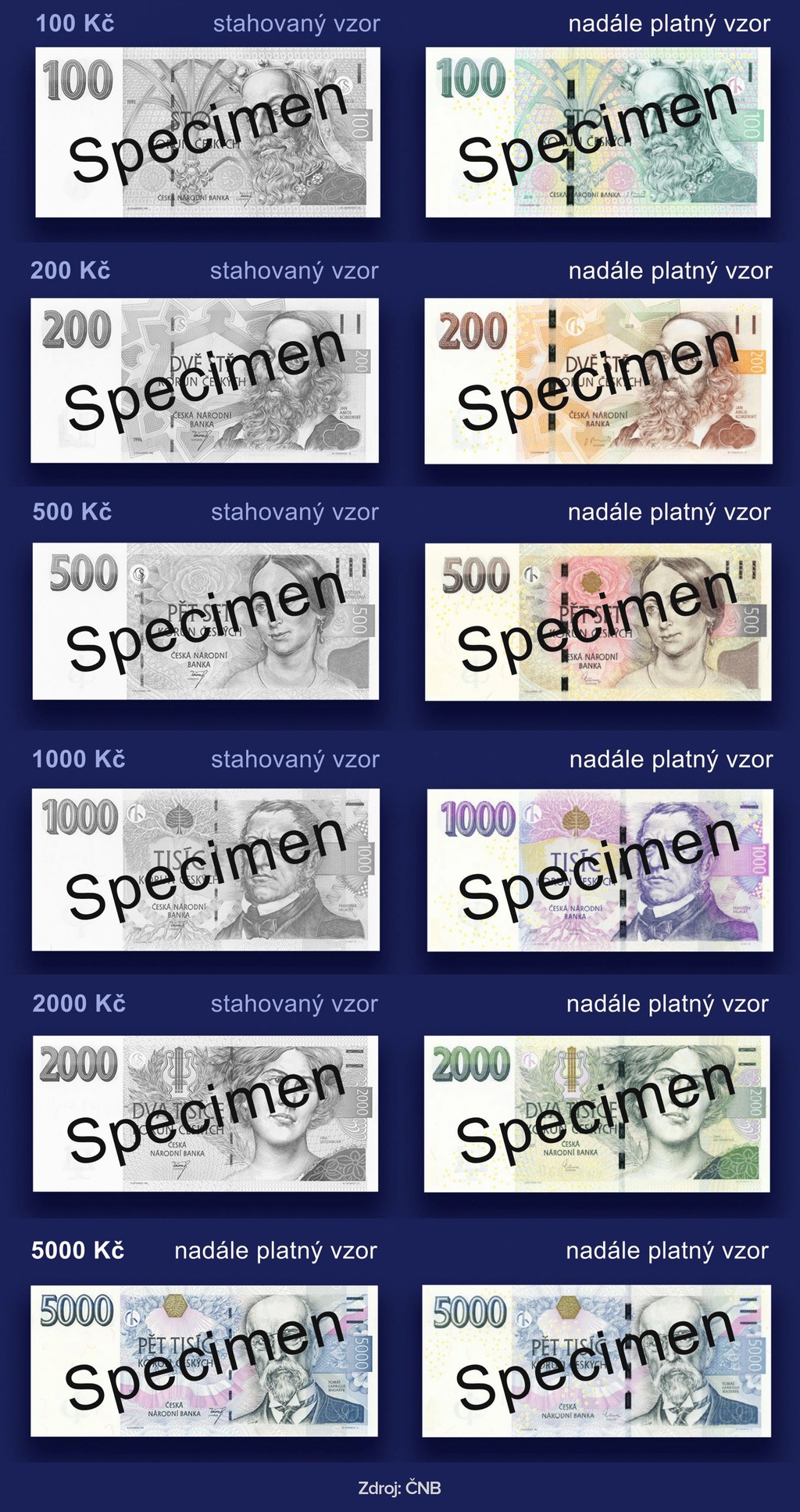 „K 30. júnu 2022 sa skončí platnosť týchto vzorov bankoviek: 100 Kč vzorov 1995 a 1997, 200 Kč vzorov 1996 a 1998, 500 Kč vzorov 1995 a 1997, 1000 Kč vzoru 1996 a 2000 Kč vzorov 1996 a 1999,“ spresnila ČNB na svojom webe.
