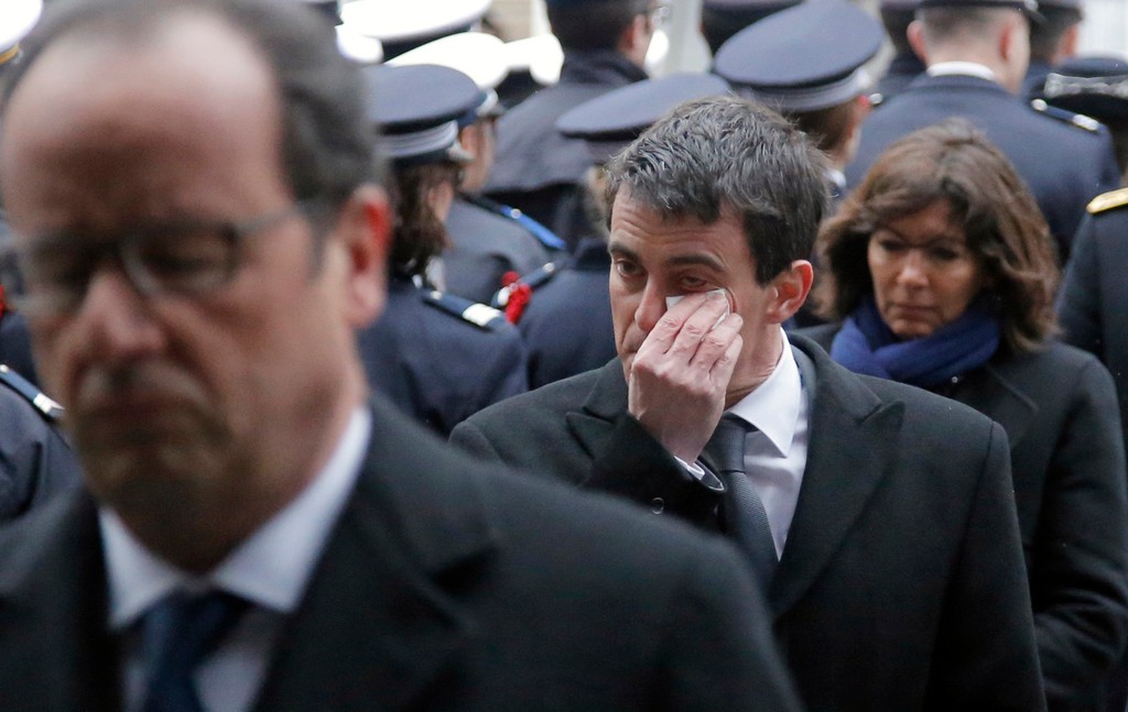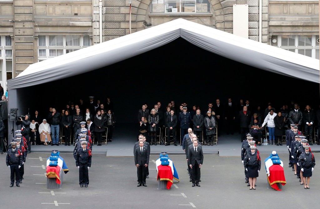 Prezident a ďalší najvyšší predstavitelia Francúzskej republiky si na nádvorí sídla parížskej polície uctili pamiatku policajtov Ahmeda Merabeta, Francka Brinsolara a Clarissy Jean-Philippovej.