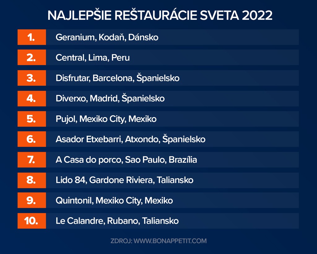 Pandémia koronavírusu na krátky čas prerušila vyhlasovanie každoročného rebríčka najlepších reštaurácií na svete. Pre rok 2022 je ich hneď 50. Mnohé sa nachádzajú v Európe a jedna z nich je dokonca iba na skok od Bratislavy.