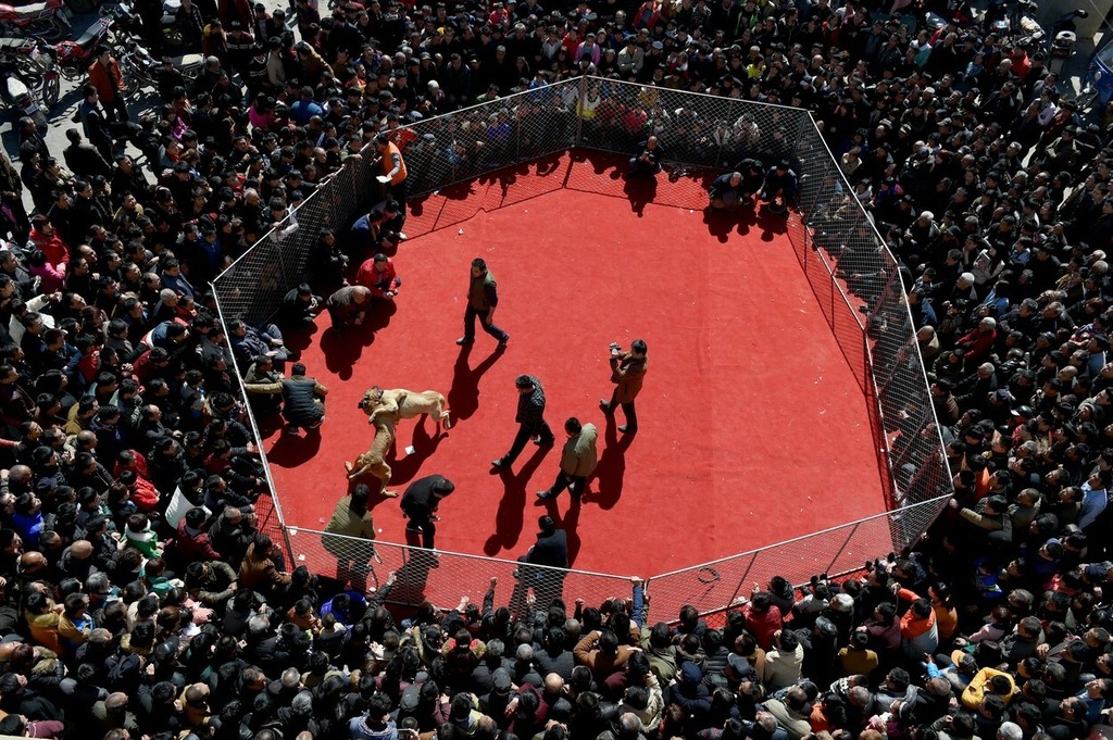 Psie zápasy zachytili fotoaparáty v obci Sanjiao v severnej Číne. Do súťaže sa mohol prihlásiť každý, kto má psa. Odmenou pre víťaza bola krabička cigariet a porcelánový hrnček. Zápasy trvali niekoľko dní.