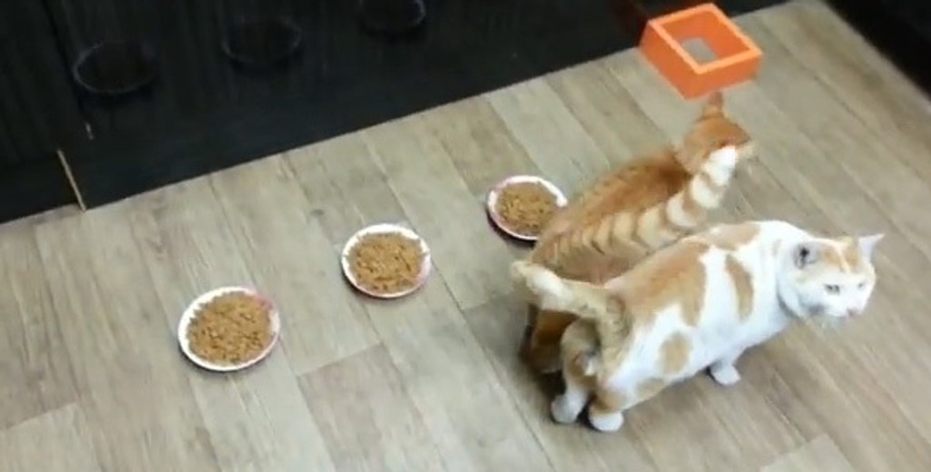 Jedna z mačiek to radšej vzdala a pokojne odišla. Tá druhá sa ale chcela najesť, a tak sa pokúšala dostať raz k jednej, raz k druhej miske. Ryšavá kamoška ju ale okamžite odohnala. Takto sa poriadne nenajedla ani ona.