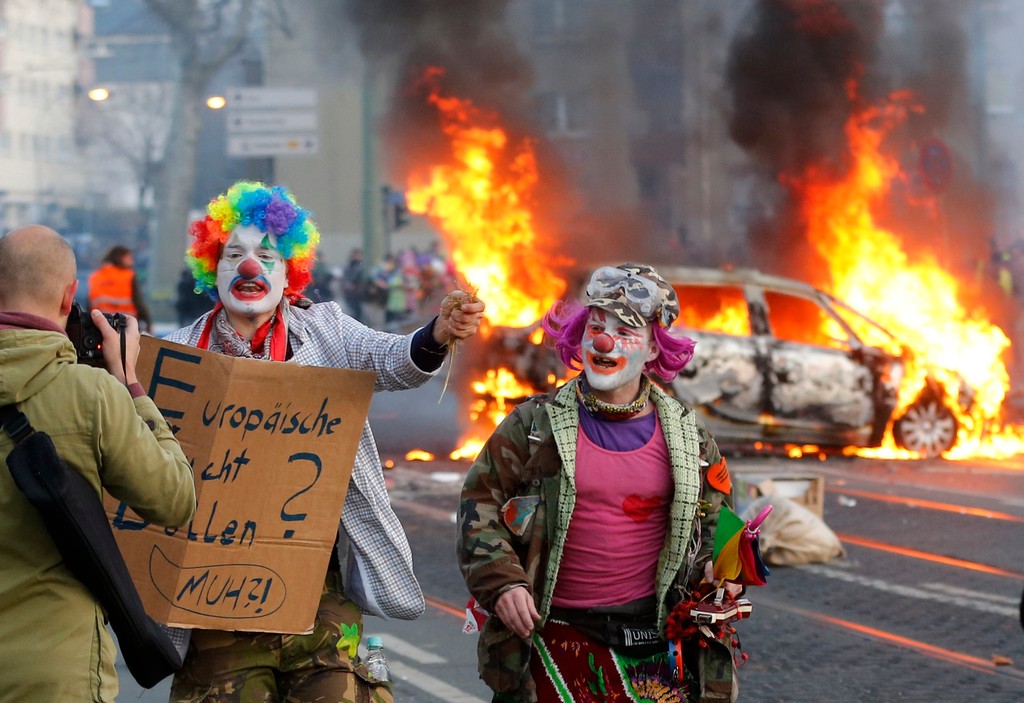 Násilní aktivisti tiež hádzali pri budove Starej opery (Alte Oper) na rozostavených policajtov kamene, pričom jedného z nich zranili. Niekoľko tisíc príslušníkov poriadkových zložiek má pod dohľadom skupiny násilne orientovaných aktivistov, ktoré podľa nich zneužívajú dav pre krytie.
