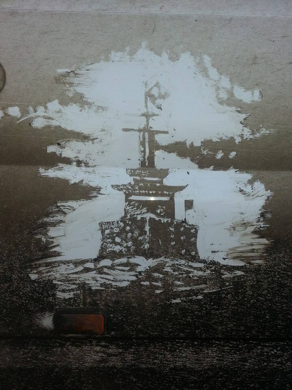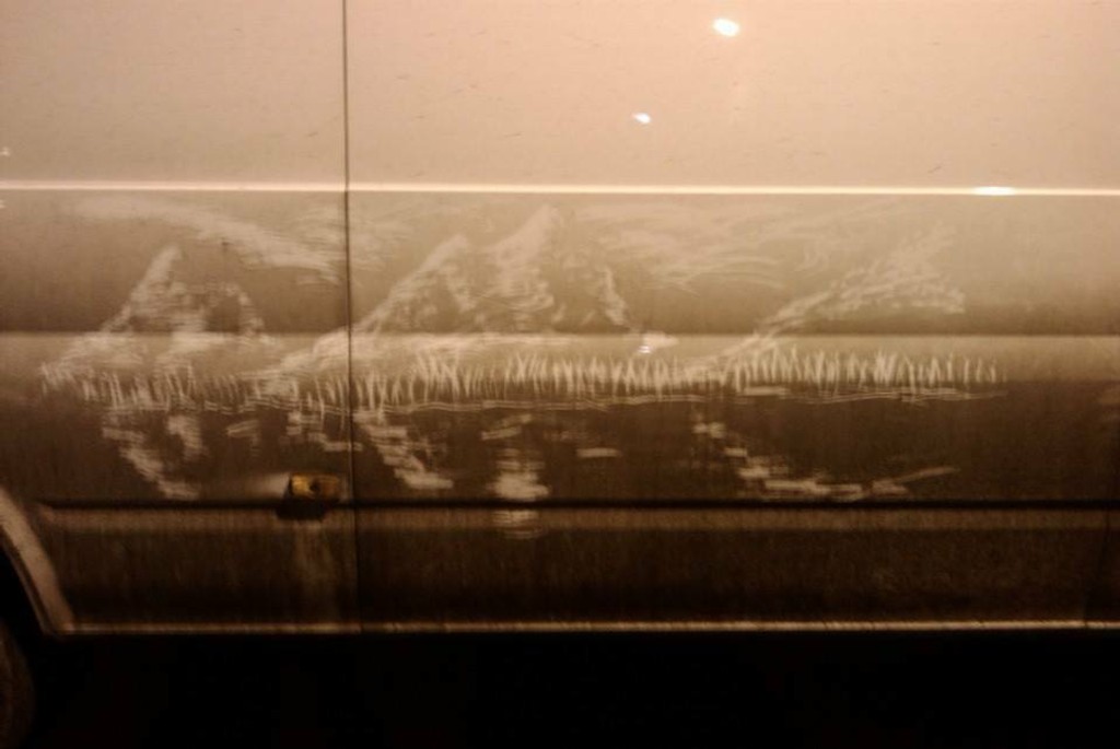 Špinavú dodávku využíva ako maliarske plátno. Na svojom aute vytvoril už niekoľko nádherných obrazov ako zimnú krajinu, deti hrajúce sa v snehu či vojnovú loď.