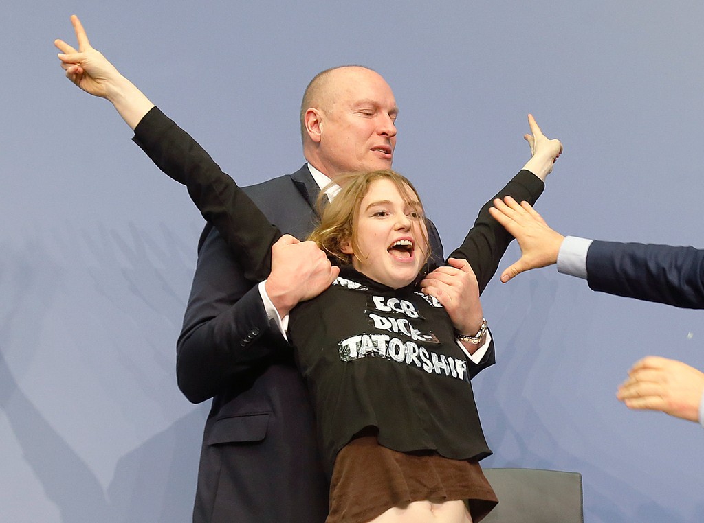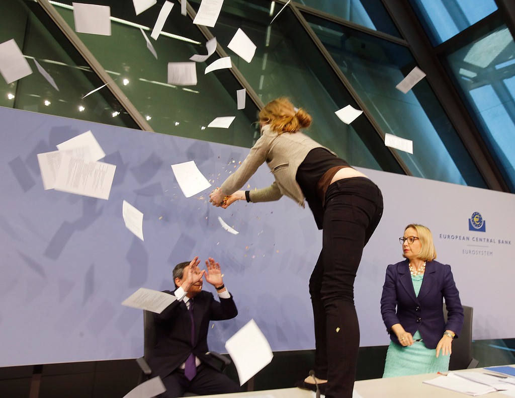 Dnešná tlačová konferencia v sídle Európskej centrálnej banky (ECB) vo Frankfurte nad Mohanom bola na niekoľko minút prerušená kvôli žene, ktorá sa nečakane vyšplhala na stôl, za ktorým sedel šéf ECB Mario Draghi, a začala protestovať proti ECB. Uviedli tlačové agentúry DPA a Reuters.