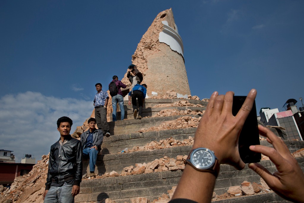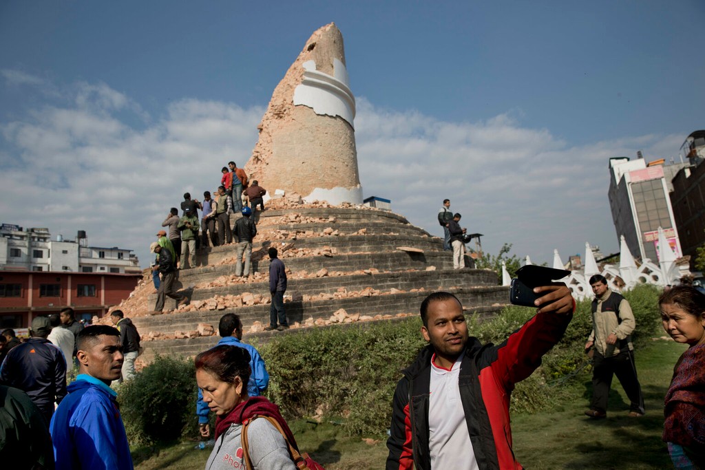 Zo slávnej historickej deväťposchodovej veže Dharahara v nepálskej metropole Káthmandu sa pri zemetrasení stala iba obrovská kopa červených tehál a prachu. Na okolité sutiny sa šplhajú desiatky ľudí a robia si „selfie" zábery s troskami veže alebo spoločné fotografie s priateľmi.