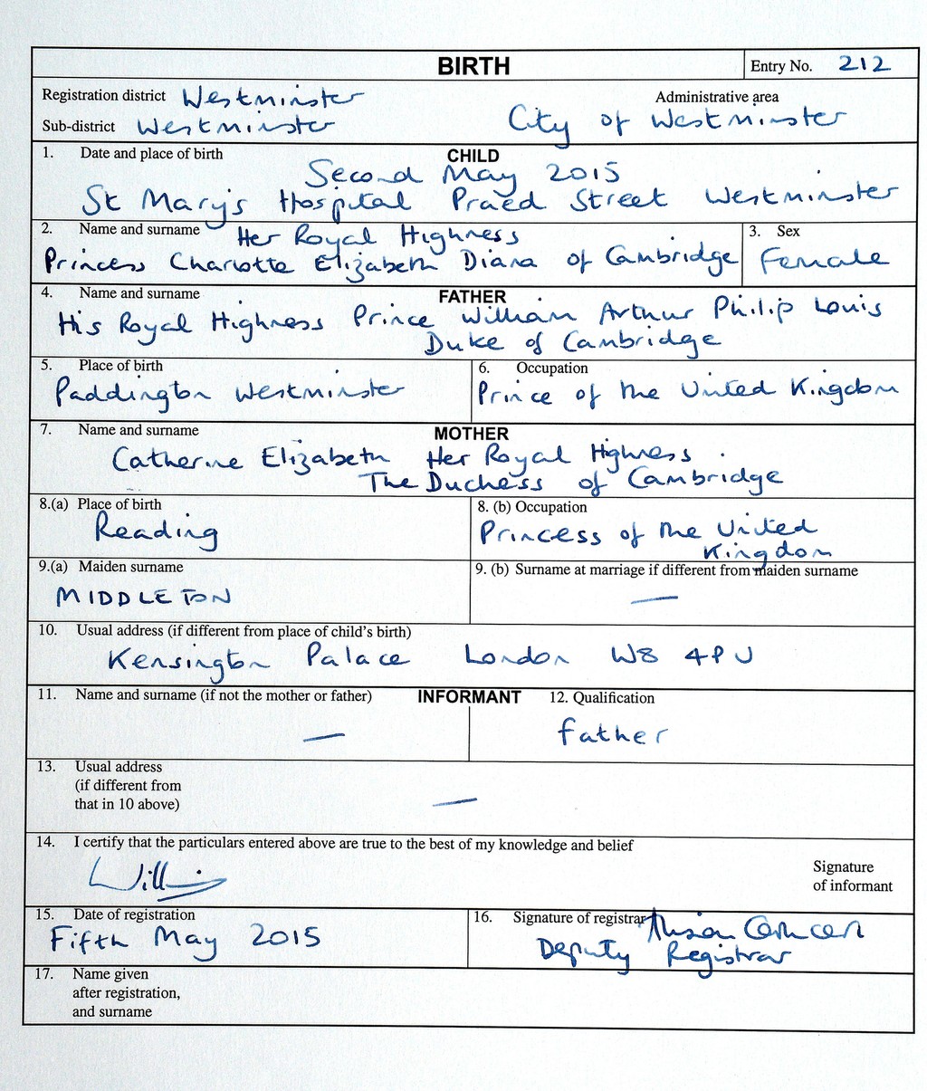 Len v kolónke meno je napísané: "Her Royal Highness Princess Charlotte Elizabeth Diana of Cambridge". V preklade to znamená "Jej Výsosť Princezná Charlotte Elizabeth Diana z Cambridge".