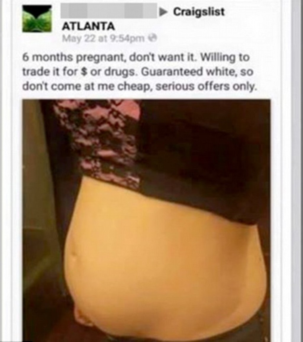 Stovky ľudí kontaktovali políciu po tom, čo si všimli nepochopiteľný inzerát na sociálnej sieti. Tehotná žena ponúkala svoje nenarodené dieťa. V príspevku nad fotkou svojho bruška napísala, že dieťa vymení za drogy alebo peniaze.