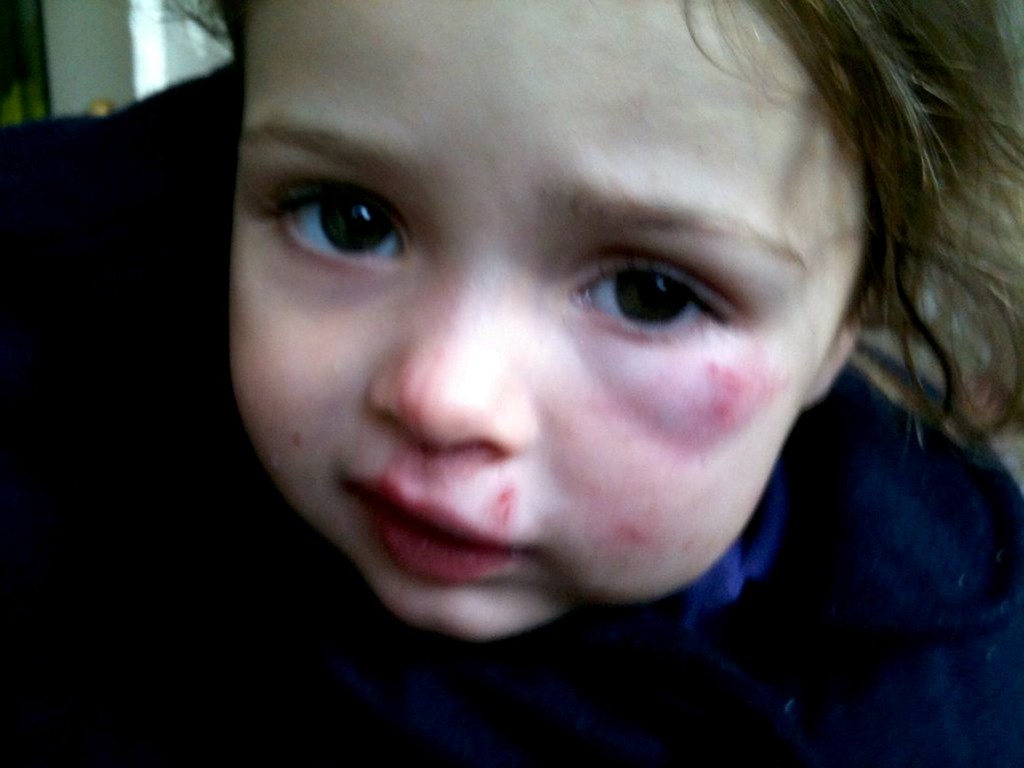 Katie Ann Guttridgeová (2) prišla zo škôlky s pomliaždeninami na tvári, škrabancami a uhryznutiami. Jej nemenovaná kamarátka ju zbila počas hrania. Matka Clara teraz žiada materské zariadenie, aby nezvládnuteľné dieťa vylúčili.