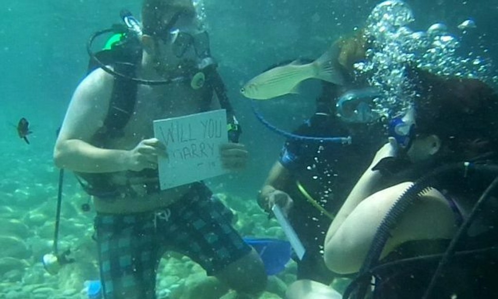 Anthony Taylor (27) a Stephanie Walkerová (26) boli na spoločnej dovolenke v tureckom letovisku Marmaris. Popri oddychu si vyskúšali aj potápanie, a tak Anthonymu zišla na um skvelá myšlienka, požiadať svoju priateľku pod vodou o ruku. Inštruktori mu pomohli s nápisom vezmeš si ma a v 12 metroch pod hladinou mora Anthony kartičku vytiahol.