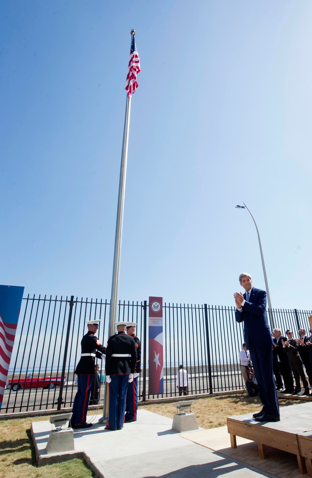 Agentúra AP informuje, že okrem Kerryho sa na slávnostnej ceremónii zúčastnili aj traja príslušníci americkej námornej pechoty, ktorí vlajku na havanskom veľvyslanectve spúšťali v roku 1961, keď Spojené štáty s Kubou prerušili diplomatické vzťahy. Opätovné vztýčenie dnes sprevádzali ovácie a tóny americkej štátnej hymny.