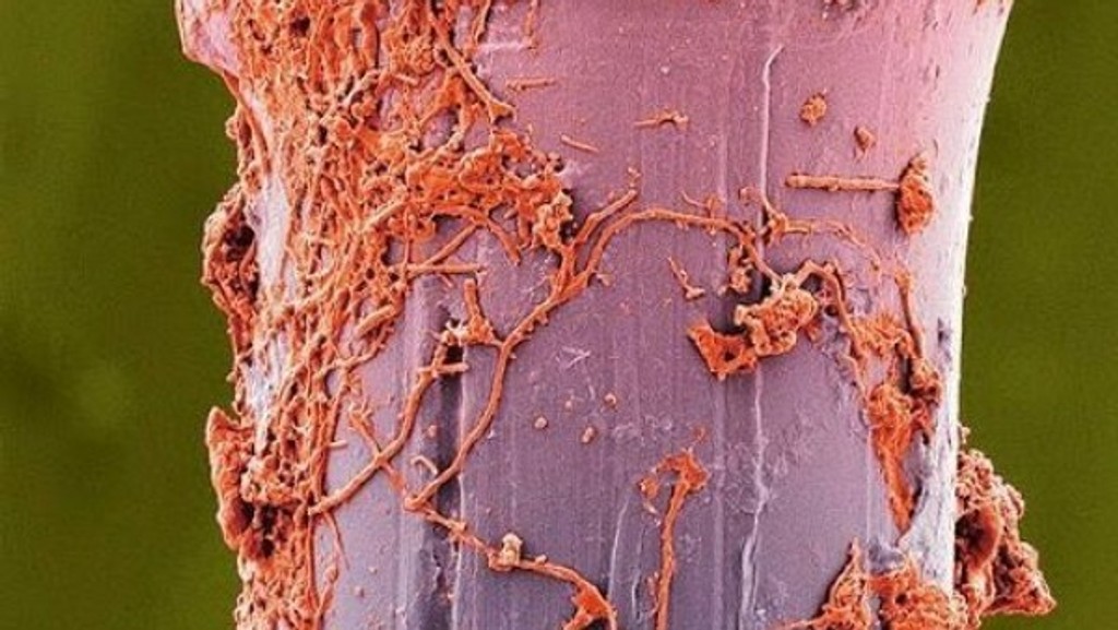 Štetina na obrázku je obalená povlakom, ktorý je ľudským okom neviditeľný. Pri pohľade cez mikroskop sa vám ale naskytne pohľad na špinu, ktorú si možno dennodenne strkáte do úst.