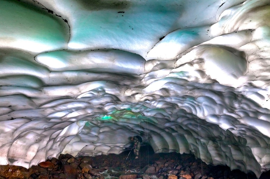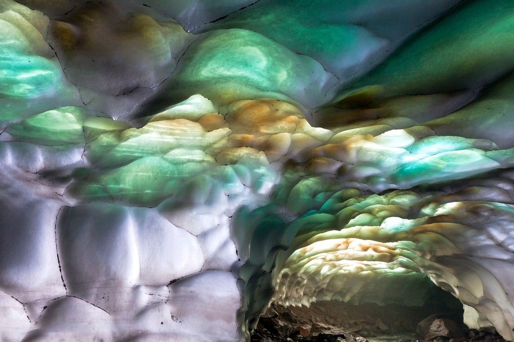 Slnečné lúče prechádzajú rôznou hrúbkou ľadovej steny a tým vznikajú pestré farby dúhy. Nádherné tunely v jaskyni vyhĺbil teplý prameň, ktorý ohrieva Mutnovskaja sopka. Tunel má približne jeden kilometer.