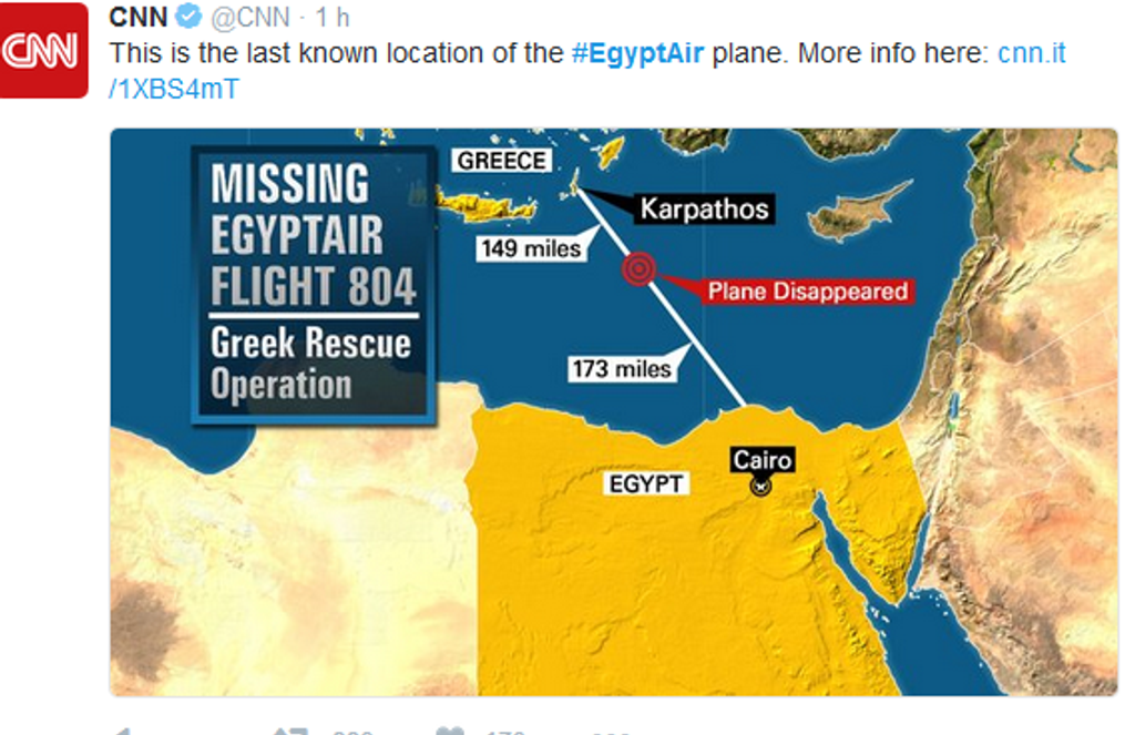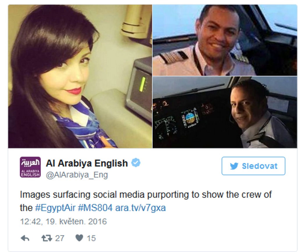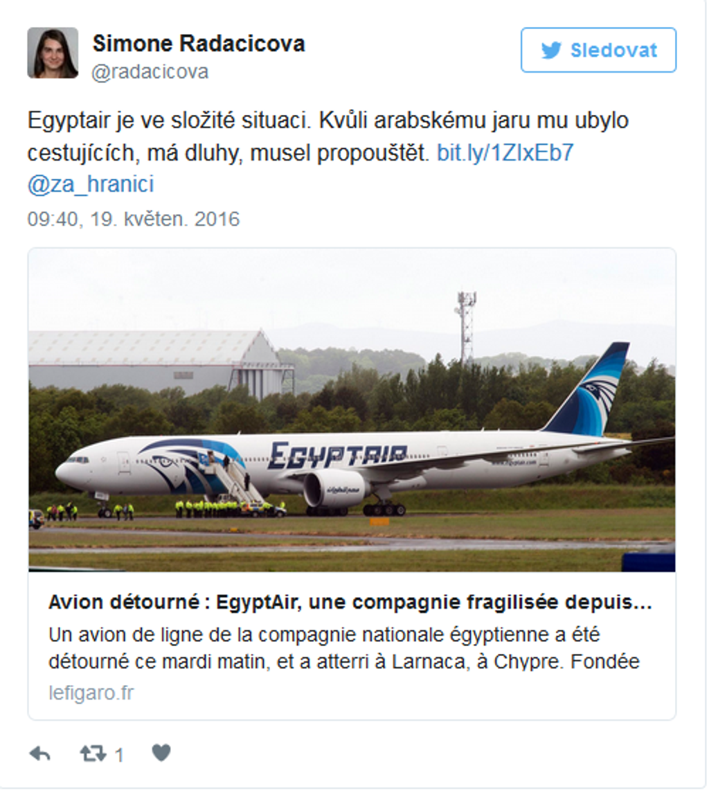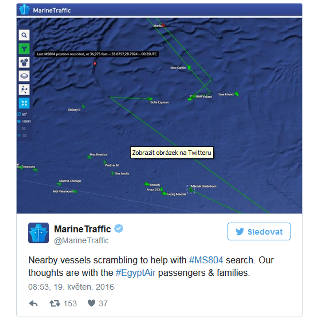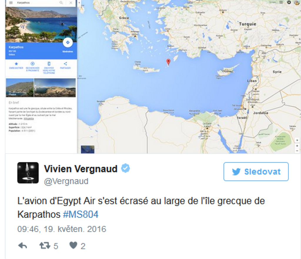 Dopravné lietadlo spoločnosti EgyptAir, let MS804, smerujúce z Paríža do Káhiry, sa stratilo z radarov. Lietadlo vyštartovalo z parížskeho Letiska Charlesa de Gaulla v stredu o 23.09 h SELČ. Dispečeri s ním stratili kontakt vo štvrtok o 02.45 h SELČ ešte predtým, ako dosiahlo egyptský vzdušný priestor. V Káhire malo pristáť o 03.00 h SELČ. Na palube bolo 66 cestujúcich vrátane posádky. Predstavitelia egyptského civilného letectva už potvrdili, že stroj sa zrútil do Stredozemného mora.