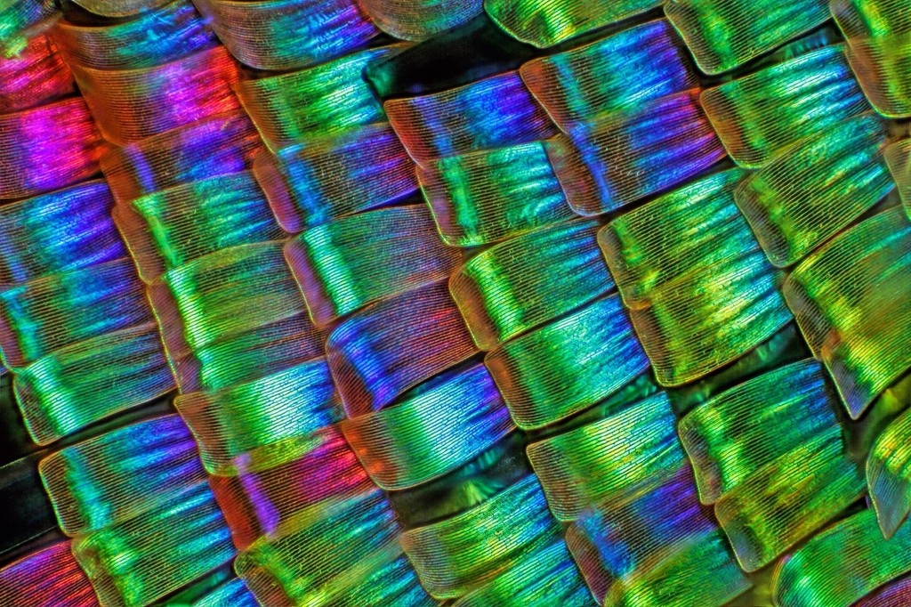 Motýľ Chrysiridia rhipheus má na svojich krídlach krásne žiarivé farby, preto sa ich rozhodli priblížiť cez mikroskop.