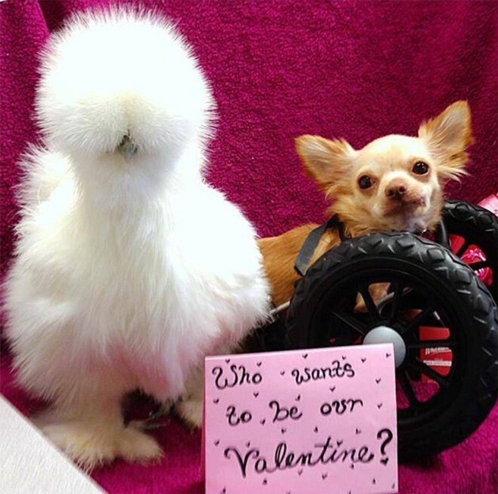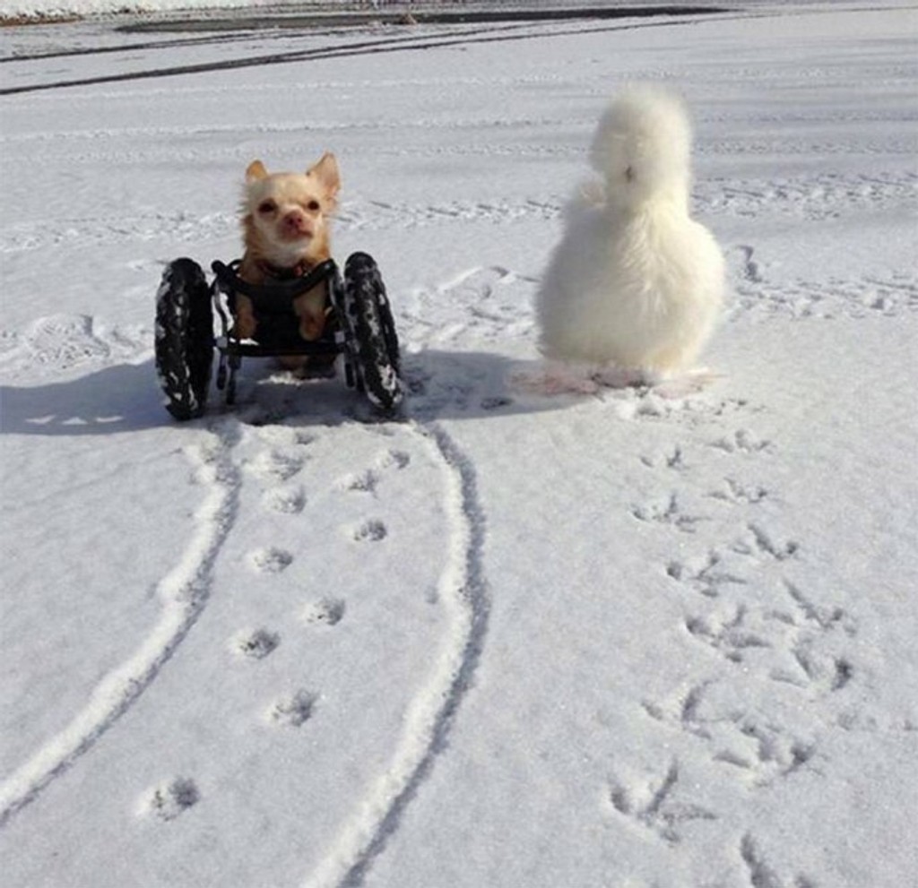 Nezvyčajná dvojica priateľov si už získala mnoho fanúšikov. Fotografie psíka a kuraťa zaujali tisíce ľudí. Penny je biele načuchrané kura, ktoré zachránili za pokusného laboratória a Roo je dvojnohá čivava odkázaná na "invalidný vozík".