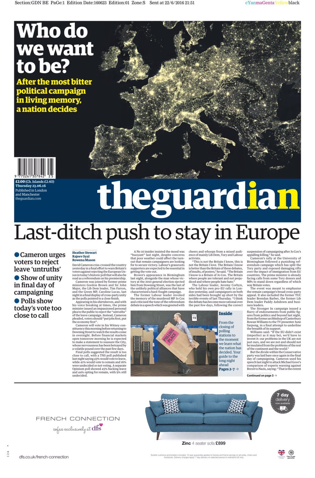 Financial Times vyslali už skôr signál, že podporia premiéra a zotrvanie v EÚ. "Čím chceme byť? Po najkrutejšej kampani v histórii, národ rozhodne," píše The Guardian.