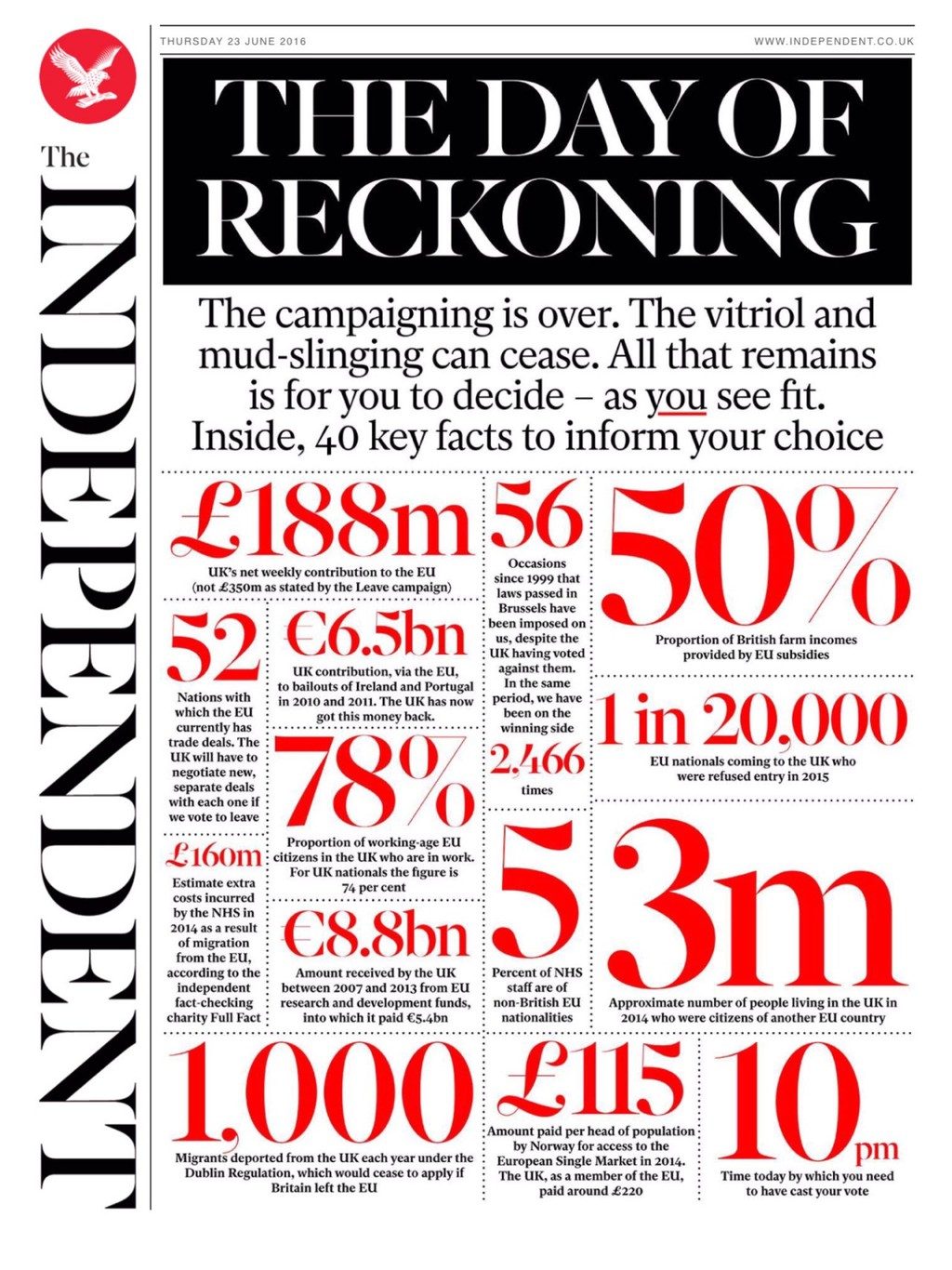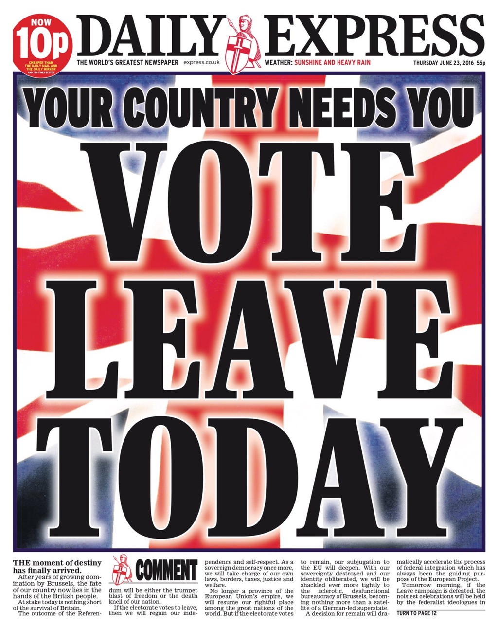 The Times sa nakoniec priklonili na stranu Davida Camerona a v úvodníku v sobotu vyslovili myšlienku, že pre Britániu bude voľba zostať v EÚ čisto pragmatická, bez zbytočného entuziazmu. Na svojej titulke skombinovali vesmír a Shakespeara: "Pre svet som iba kvapka vody, ktorá v oceáne hľadá druhú kvapku."