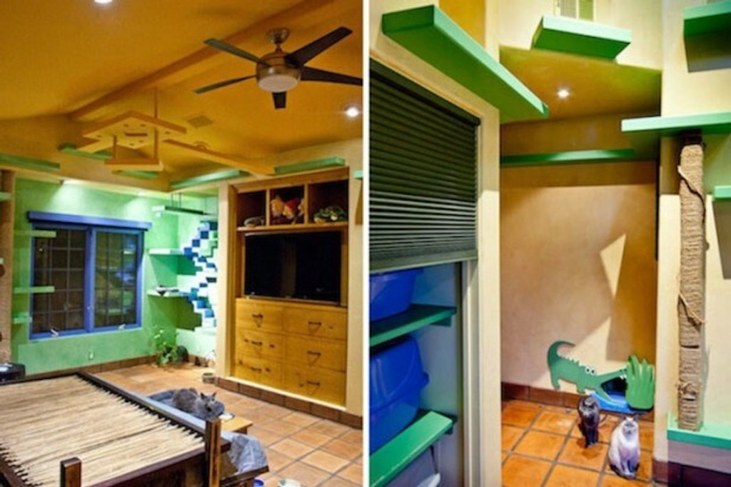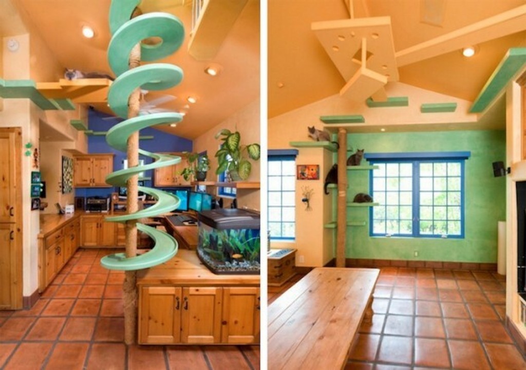 Muž z Kalifornie je skutočný milovník mačiek. Doma ich má osemnásť a z lásky k nim a ich komfortu, vytvoril zo svojho domova jedinečné ihrisko. S pomocou stavebnej firmy každú jednu izbu vymaľoval, doplnil mostíky, preliezačky a šmýkačky.