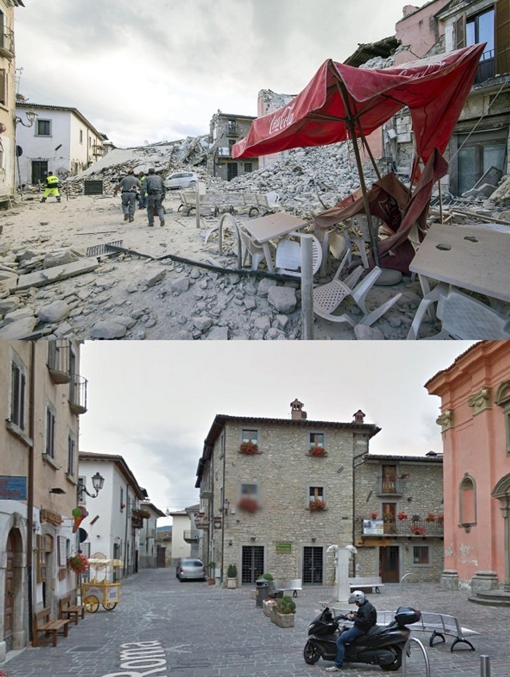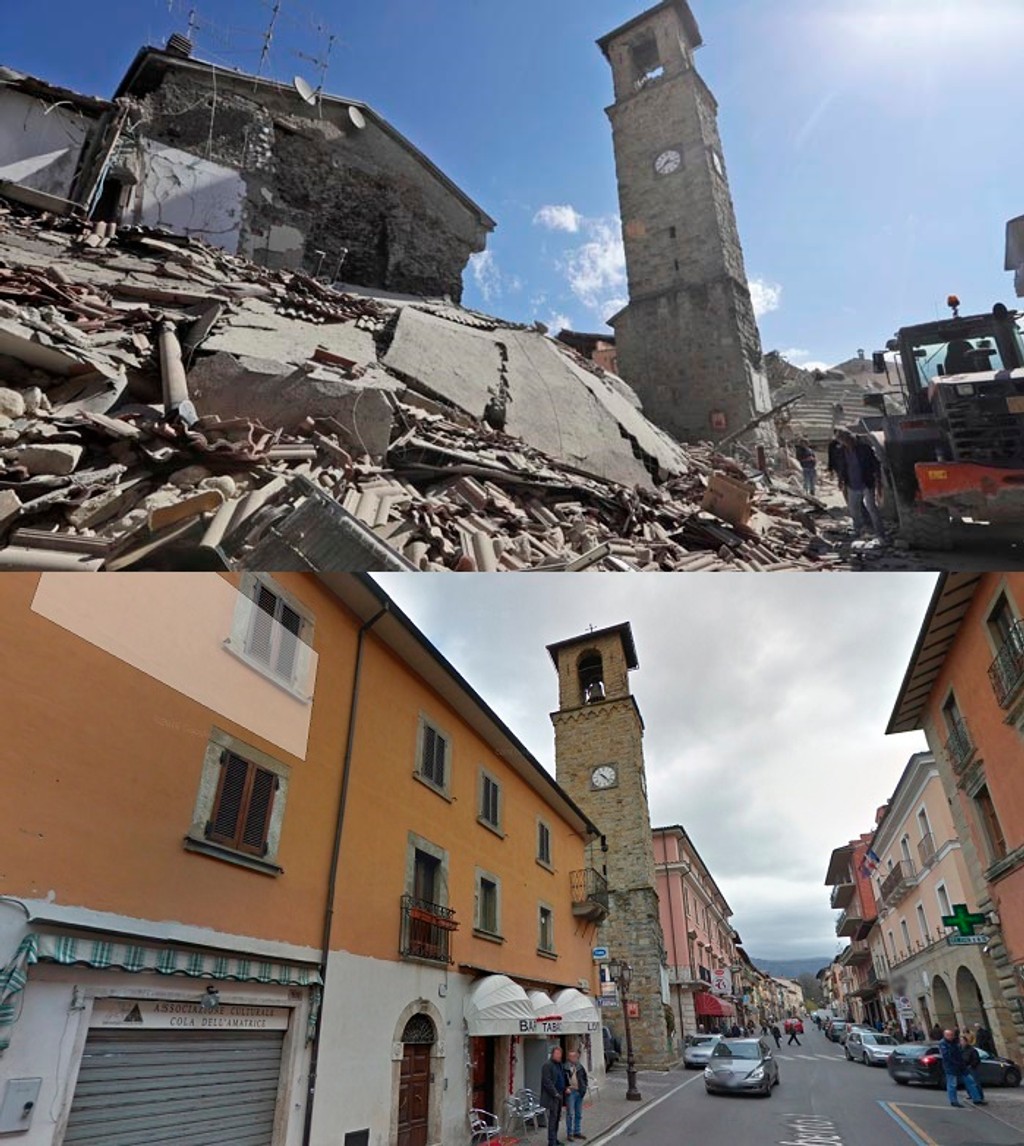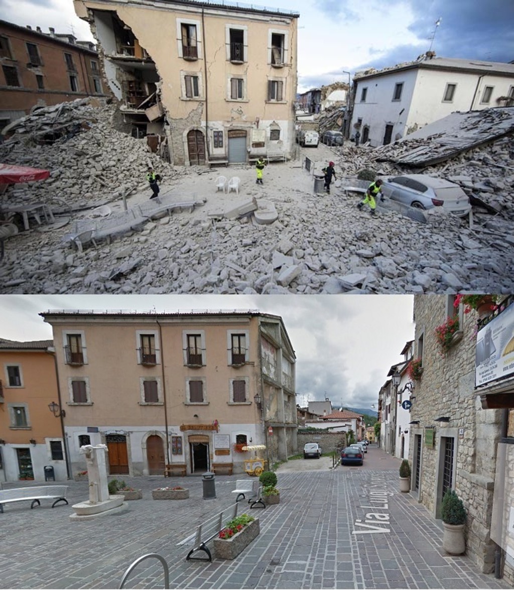Jedna zo snímok ukazuje krásne nádvorie s elegantnou starovekou vežou s hodinami. Veža sa teraz čiastočne zrútila, domy v okolí sa rozpadli. Ulica je na nepoznanie. Tradičné historické budovy broskyňovej farby sú teraz úplne zničené.Talianske mestečká zrovnané so zemou