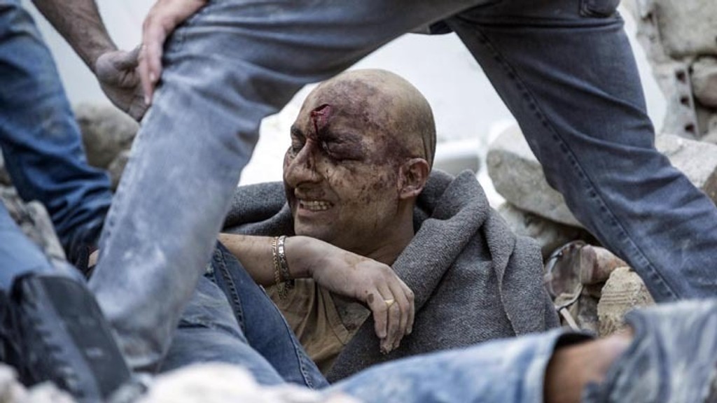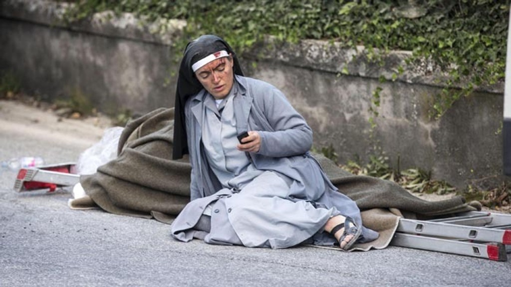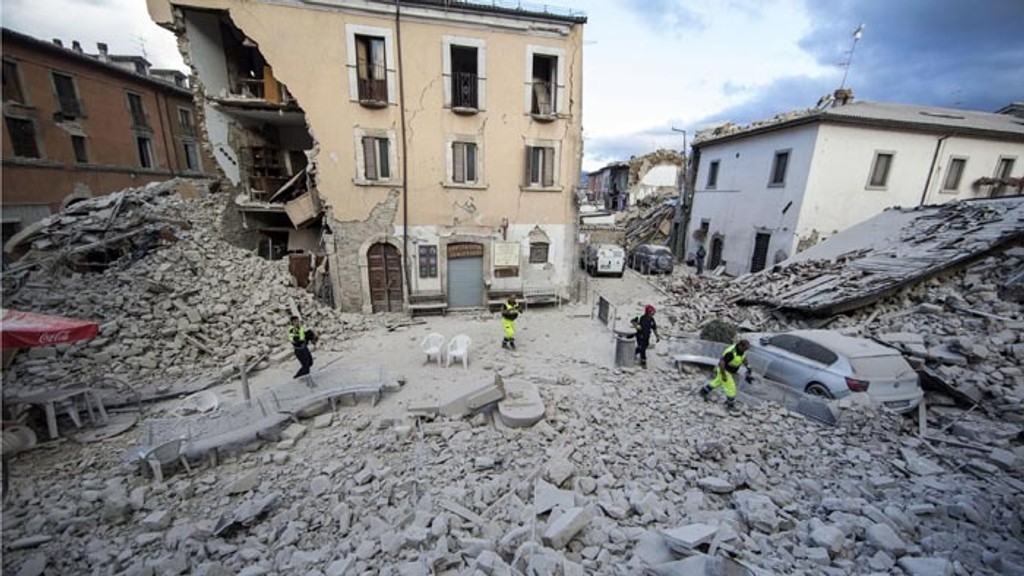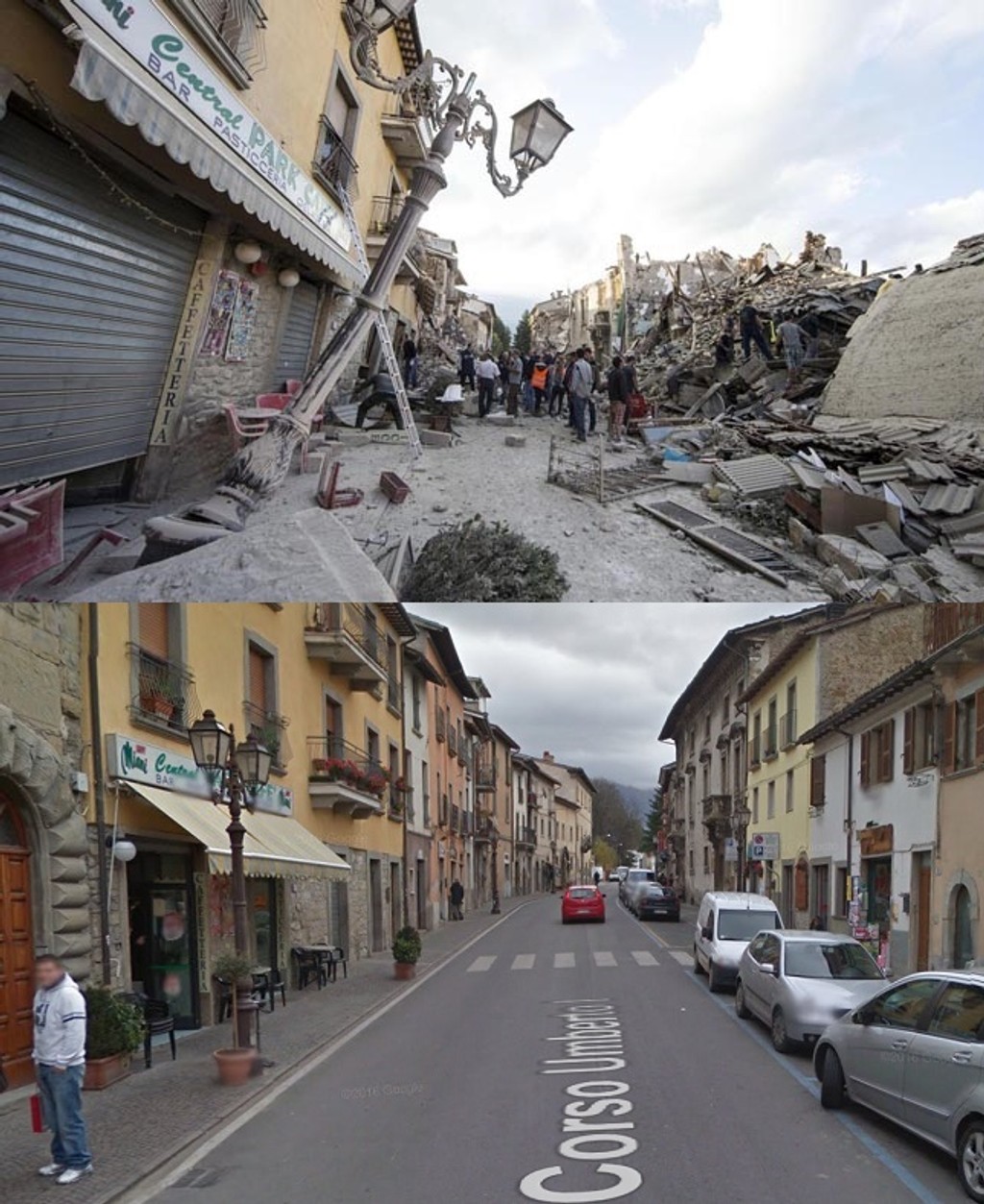 Jedna zo snímok ukazuje krásne nádvorie s elegantnou starovekou vežou s hodinami. Veža sa teraz čiastočne zrútila, domy v okolí sa rozpadli. Ulica je na nepoznanie. Tradičné historické budovy broskyňovej farby sú teraz úplne zničené.Talianske mestečká zrovnané so zemou