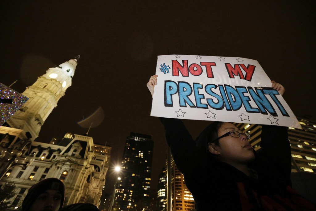 Takmer 24 hodín po tom, ako sa republikánsky kandidát stal víťazom prezidentských volieb, mnohí stúpenci jeho demokratickej súperky Hillary Clintonovej začali verejne prejavovať frustráciu a obavy o budúcnosť krajiny. Na internetových sociálnych sieťach sa čoskoro objavil aj hashtag #NotMyPresident (Nie je môj prezident).