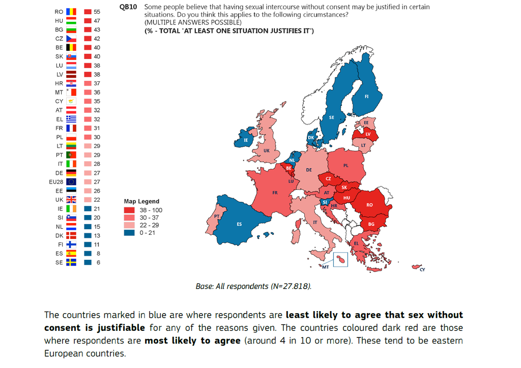 V niektorých európskych krajinách si viac ako polovica populácie myslí, že za istých okolnosti môžu pohlavný styk bez súhlasu ospravedlniť.