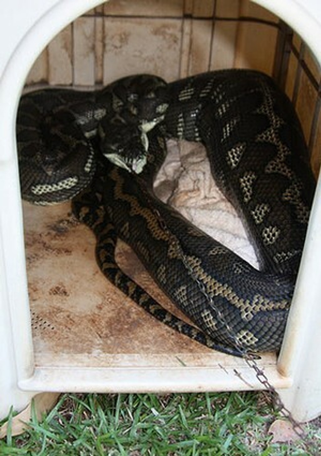 Majiteľka kríženca čivavy a maltézskeho psíka ho chcela ráno pustiť, namiesto toho však v búde našla hada s plným bruchom a retiazkou trčiacou z papule. Žena následne zavolala dobrovoľníkov Wildlife Information Rescue and Education Service (WIRES), ktorí po príchode na miesto najprv odrezali reťaz od búdy a počkali 24 hodín, či pytón zvyšok reťaze vyvráti.