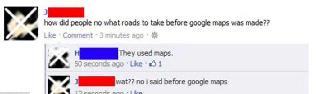 "Ako trafili ľudia tam, kam chceli, keď ešte neboli Google mapy?" "Používali mapy," odpísal mu jeden z jeho priateľov. "Čo? Nie, ja som hovoril o google mapách," reagoval autor hlúpeho statusu.