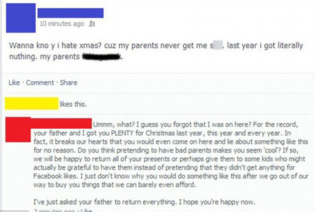 Neznámy človek sa na Facebooku posťažoval, ako od rodičov nedostáva darčeky na Vianoce a dobre si na nich ponadával. Zabudol však, že má mamu medzi priateľmi a tá mu status šťavnato okomentovala. Označila ho za klamára, ktorý len chce, aby ho poľutovali a túži po likeoch. Požiadala otca, aby všetky nakúpené darčeky vrátil.