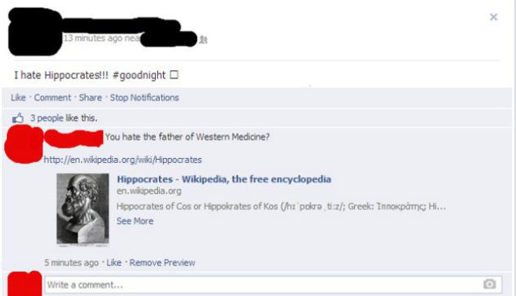 Ďalší z kandidátov napísal status, ako nenávidí pokrytcov. Alebo aspoň chcel. Namiesto anglického slova hypocrites (pokrytci) napísal Hippocrates - Hippokrates - bol antický Grék považovaný za jedného z najvýznamejších lekárov všetkých čias, ktorý položil základy niekoľkých oborov medicíny.
