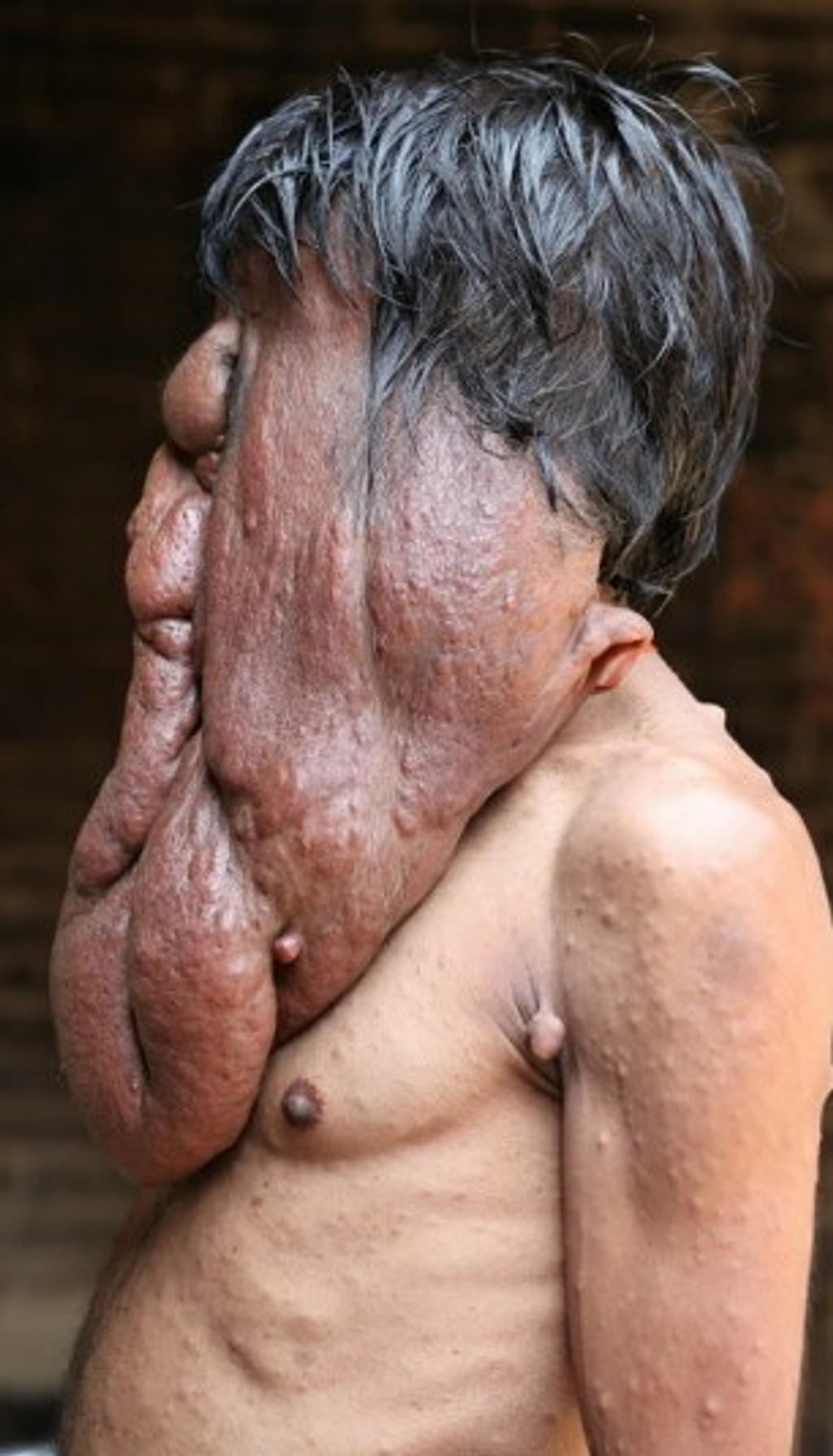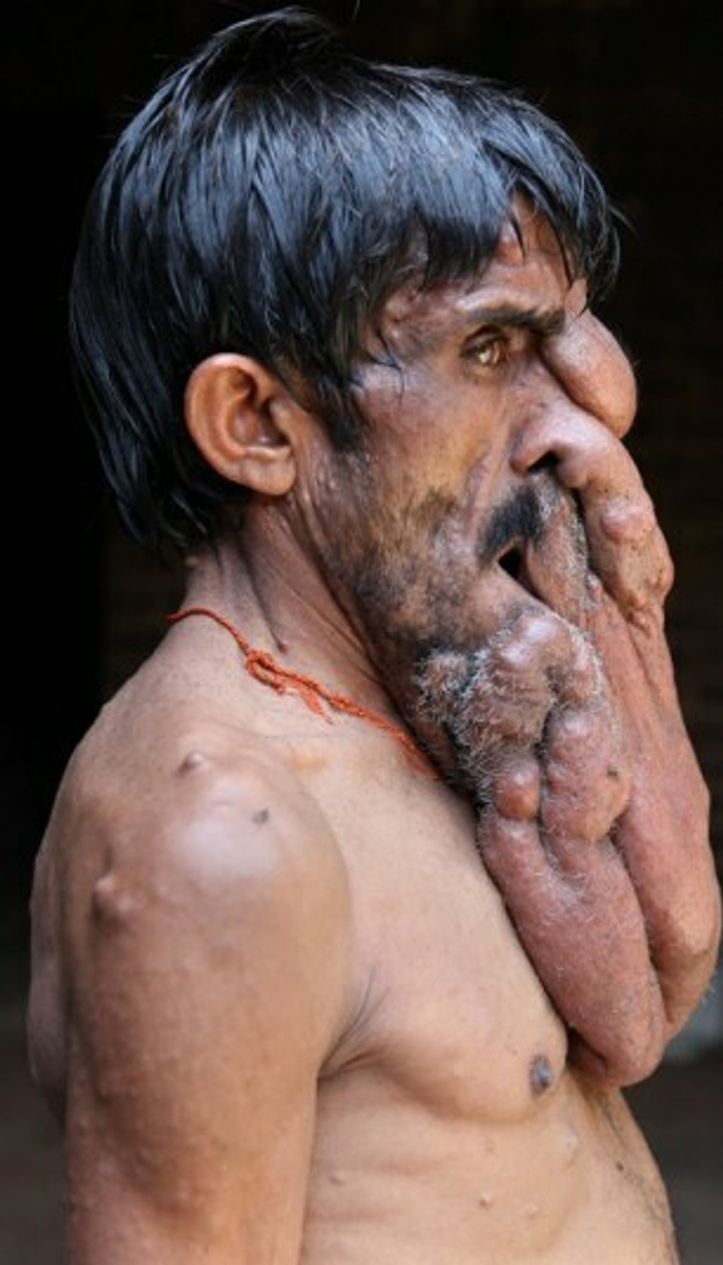 Chana Lal (35) z indického Uttar Pradesh nemôže jesť ani správne rozprávať. Trpí ťažkou neurofibromatózou a na tvári má obrovský 4-kilový tumor, ktorý mu zasahuje až na hrudník. Vyhýba sa zrkadlám a žije sám z podpory dvoch neterí.