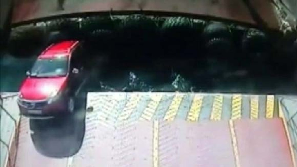 Zábery z bezpečnostnej kamery nákladného plavidla ukazujú, ako červené auto pomaly vchádza na trajekt. Loď sa už v tej chvíli nešťastne posúvala a medzi autom a brehom vznikla obrovská medzera.